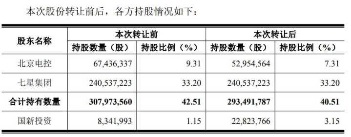上述转让完成后,北京电控直接持有北方华创5295.46万股股份,持股比例为7.31%;并通过全资子公司七星华电科技集团有限责任公司(以下简称七星集团)持有北方华创2.4亿股股份,持股比例为33.20%。北京电控合计持有北方华创2.93亿股股份,合计持股比例为40.51%,仍为北方华创实际控制人。